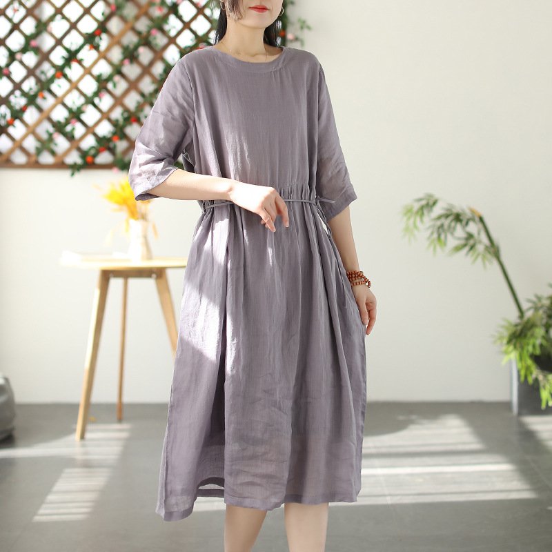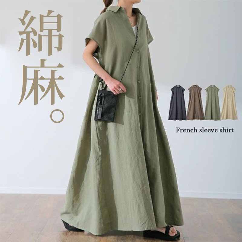 綿麻オシャレカジュアルラペル半袖ワンピース